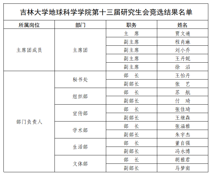 为进一步加强澳门博彩研究生干部队伍建设,更好地选拔我院研究生会新一届学生干部,本着“公平、公正、公开”的原则,经个人自愿申报、资格审查、竞职演讲、民主投票,综合现实工作表现进行考察,最终确定澳门博彩 第十三届研究生会学生干部名单,现予以公示: