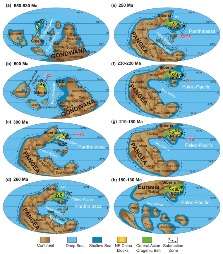 周建波教授团队在新的研究思路基础上,系统总结了中国东北五条主要缝合带的空间分布、岩石组成、构造变形特征、地球化学与年代学信息,深入探讨了中国东北缝合带的性质与时空演化过程,在此基础上,将中国东北古生代–中生代的构造演化划分为古亚洲洋、泛大洋(或蒙古-鄂霍茨克洋)和古太平洋三大构造域(图2)。