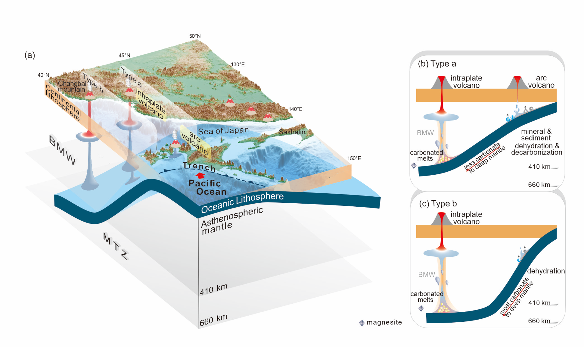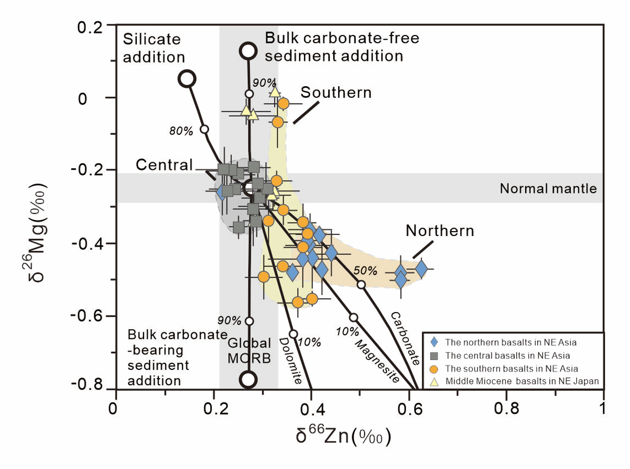地球深部动力学创新团队”联合中国地质大学(北京)刘盛遨教授,对东北亚陆缘、平行于俯冲带分布的中新世板内玄武岩开展了系统的Mg-Zn同位素研究(图1),结合东北亚陆缘新生代玄武岩中地幔捕虏体的空间分布和地球物理观测资料,为单一俯冲带小尺度碳输入的三维空间变异提供了关键证据。具体研究成果如下: