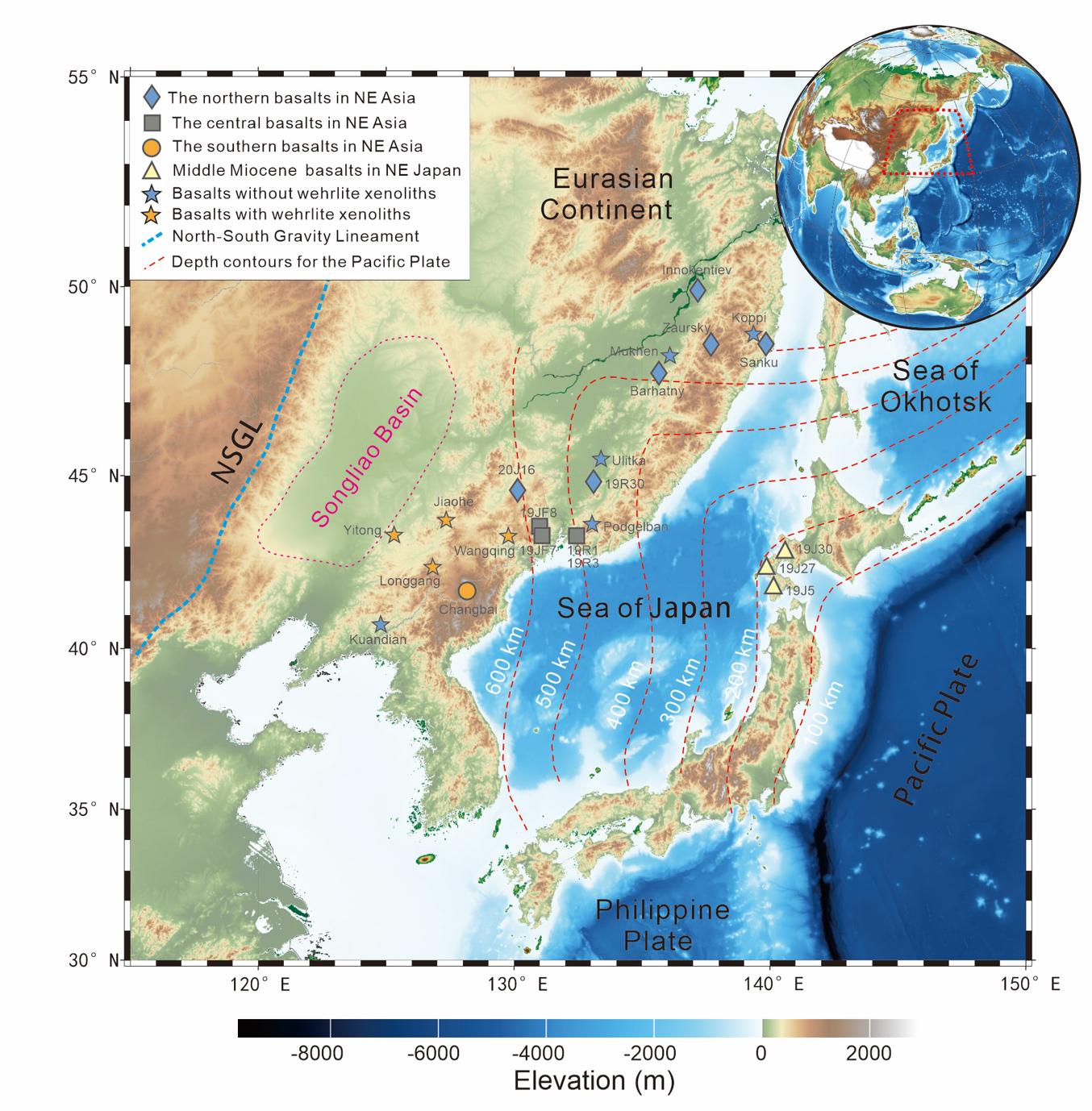 图1 东北亚陆缘中新世玄武岩及地幔捕虏体分布图
